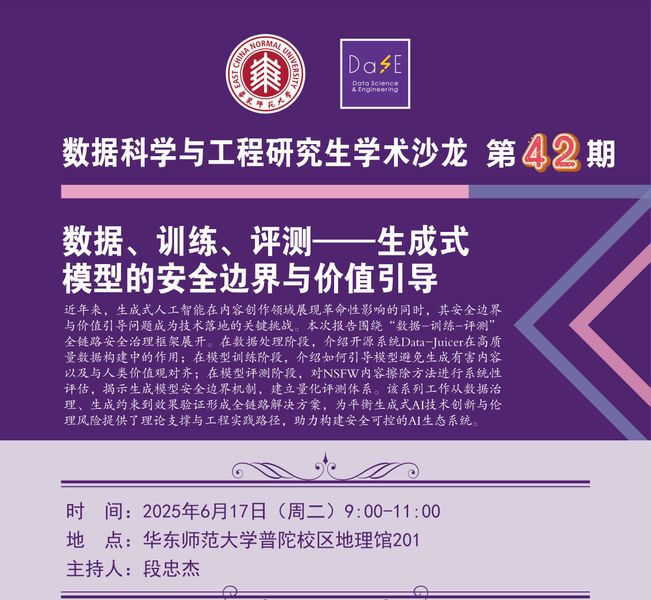 6月17日研究生学术沙龙(第42期) | 数据、训练、评测——生成式模型的安全边界与价值引导